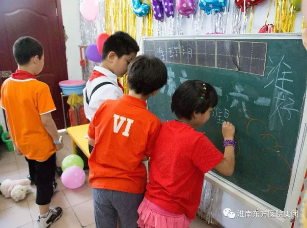 志願者們紛紛融入到福利院的小朋友中間去,與他們交流玩耍,有的教孩子們玩自己帶來的玩具,有的彎下腰來、蹲在地上和孩子們交流,撫摸他們可愛的小臉蛋,還有的少先隊小志願者和福利院的孩子一起在小黑闆上互相寫着自己的名字,交換着彼此的趣事,孩子們的臉上都露出了天真可愛的笑容。雖然時間短暫,但是開心的笑容綻放在每一個孩子的臉上。