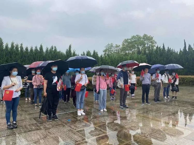 到達小崗村後,雨越下越大,卻絲毫沒有削減黨員們的參觀學習熱情。大家先去了沈浩書記墓地,在這裡開展黨史學習教育活動。