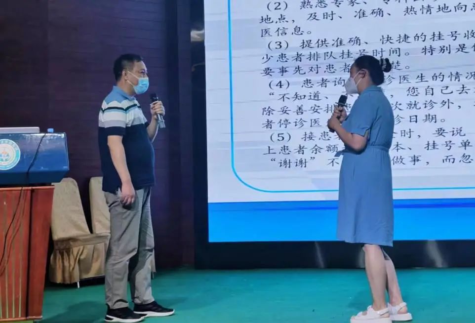 随後,培訓會開始,王翔老師運用PPT講解和現場情景模拟等形式,結合建設銀行工作經驗,圍繞窗口服務意識提升 、服務形象塑造、工作行為規範、優質服務規範、崗位服務文明用語和溝通技巧等内容進行了講解,并對什麼是服務意識、服務意識的内涵進行了透徹的分析。通過培訓引導窗口科室全體人員樹立“以患者為中心,用真心去心服務”的理念,全心全意服務好每一位患者。