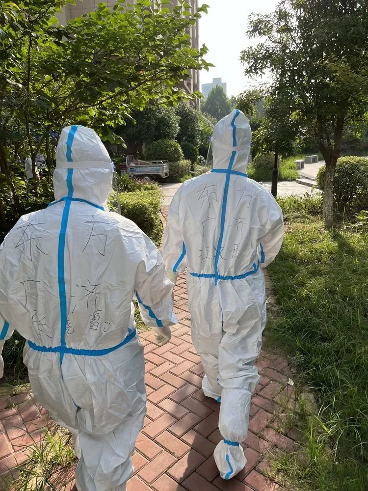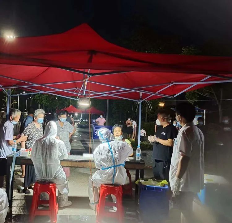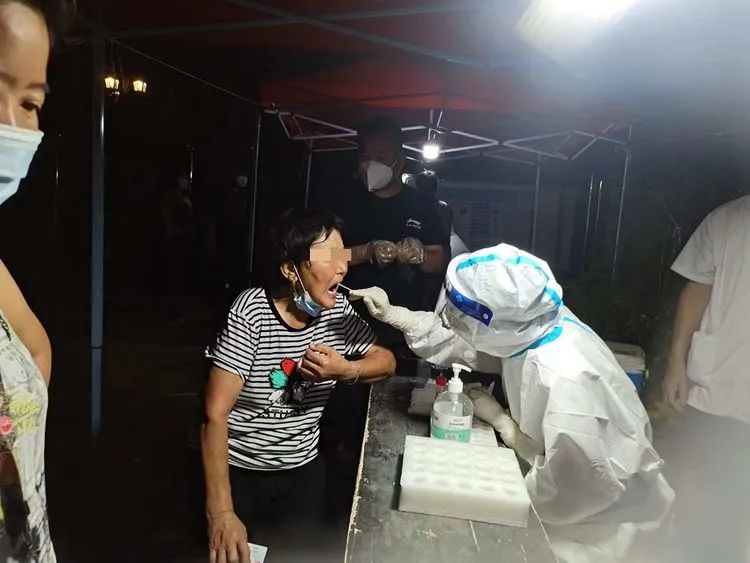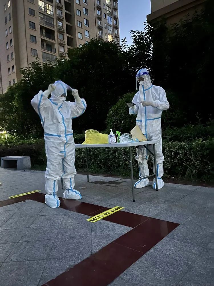 正在采樣的是隊裡的段夏夏和桂钰,她們的頭上沒有一點遮擋,最高氣溫41℃的戶外,每一個穿着防護服采樣的大白都在挑戰身體的極限。她趕緊上前,一起幫忙采樣。取出棉簽、旋轉咽拭子,放進試劑管、壓斷棉簽,不遠處的采樣點又有人倒下,然後别的點完成的同事像她一樣被喊來支援,她看到隊裡的王春晖也來了,這個不愛說話的同事,喜歡一個人坐在角落裡安靜的看手機,每天回去最晚的總是他。隊裡的三個男生,每一次分任務,都挑最重的去。