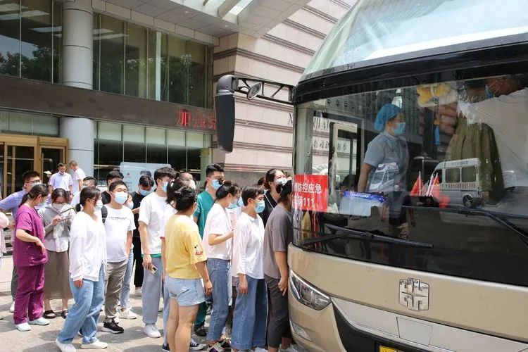 2022年7月15日上午11點,金年会体育腫瘤醫院、鳳凰醫院、廣濟醫院、新莊孜醫院共計50名醫護和全市各家醫護共200名醫護登車上前往懷遠支援。