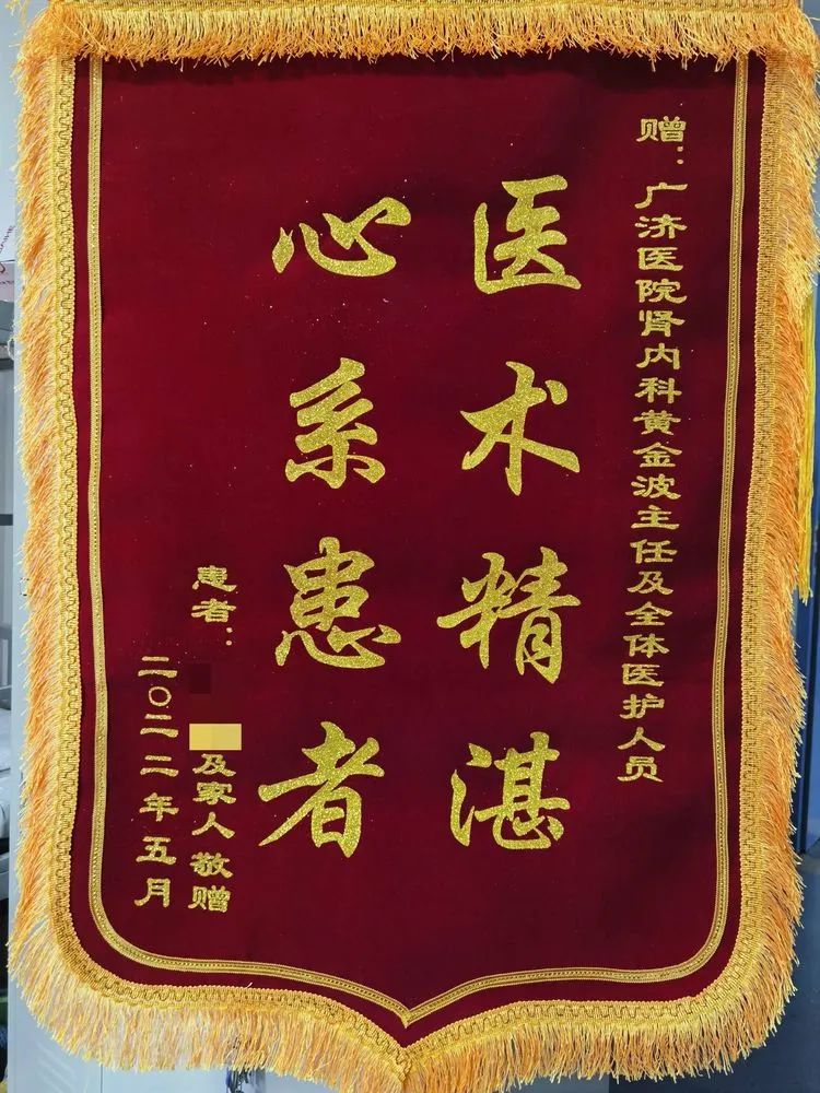 就診廣濟醫院腎内科,是因為老人“認識”黃金波主任。黃主任帶領團隊為其完善檢查後,明确診斷為“慢性腎髒病5期、血液透析、腎性貧血、腎性骨病;肺部感染;心功能Ⅲ級;冠心病;高血壓3級(極高壓);2型糖尿病”,随後為老人進行了中心吸氧,血液透析,抗感染,糾正貧血,強心,降壓,保心,補鈣降磷,止咳化痰等對症治療,老人不适症狀很快好轉,出院之際奉上一面錦旗:待患如親關懷備至真情體現親如一家。